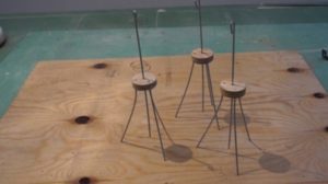После этого устанавливаются маяки, представляющего собой треноги с подвижным центральным стержнем. Они расставляются по комнате, после чего стержням задается уровень. Вся процедура занимает крайне мало времени, если у вас в наличии есть лазерный уровень. Примечание! Если треног нет, их можно заменить, например, дюбель шурупами, вкрученными на разной высоте строго в горизонт |