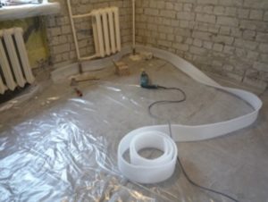 По периметру помещения необходимо набить на стены демпферную ленту. Она станет амортизатором при температурном расширении поверхности, что крайне важно при наличии системы теплого пола, а также предотвратит впитывание воды стенами.