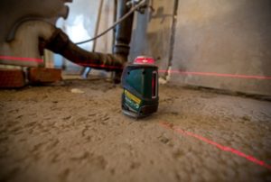 Находим в комнате самую высокую точку на полу. Проще всего это сделать при помощи лазерного уровня. Он устанавливается в центре комнаты и включается для проецирования горизонтальной линии по сторонам. Далее мастер проходит по помещению с рулеткой, попеременно устанавливая ее в разных местах, ища наименьшее расстояние от пола до красной линии.