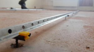По линии установки маяка устанавливаются в просверленные отверстия дюбеля. Далее накручиваются на саморезы платформы, в которые будет защелкиваться маяк. Одна из платформ устанавливается в самую высокую точку или рядом с ней, чтобы точно перенести нужный уровень. От нее выставляются все остальные. В работе используется тот же лазерный уровень или стандартный – пузырьковый. Маяки ставятся с шагом не более метра, иначе при протяжке будет прогибаться правило. Необходимо точно проверять положение маяков относительно друг друга, чтобы не нарушалась одна плоскость. Делается это при помощи того же правила, прикладываемого сверху |