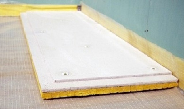 В процессе установки картонных блоков, или даже до их монтажа, по периметру комнаты устанавливаются отрезанные полосы минеральной ваты толщиной в 40÷50 мм. Они будут будут служить демпфером, разделяющим стену и сухую стяжку.