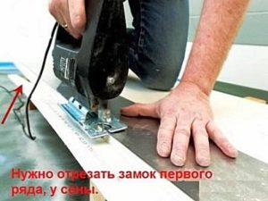 При монтаже первого ряда фаска замка, расположенная по длинной и короткой стороне панели, примыкающей к стене, отпиливается, ровно по линии с помощью электрического лобзика.