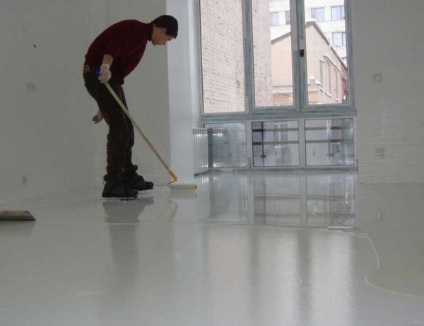 Наливные полы. Несмотря на более высокую цену, этот вариант более удобен за счет скорости проведения работ. Сегодня выпускаются цементные, гипсо-цементные и синтетические (последние обычно для выравнивания не применяются) составы с наполнителями различной зернистости. Выбор материала производится в зависимости от требуемой толщины нового основания. Разведенная наливная смесь заливается по маякам и прокатывается валиком. Так как материал — самовыравнивающийся, поверхность становится идеально ровной и горизонтальной. При этом заполняются все пустоты. Эксплуатировать новый пол можно через несколько дней (максимум — неделю).