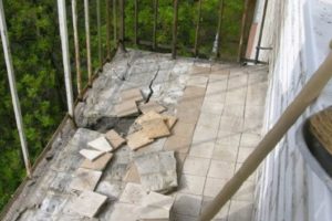 Если после снятия покрытия обнаружиться поврежденная временем плита, на ней придется сделать нетолстую выравнивающую стяжку. В случае обнаружения на ней незначительных трещин и сколов, их необходимо заделать бетонным раствором. При проведении ремонта отдельно обустроенного балкона в домах старых построек сильно утяжелять конструкцию недопустимо. |
