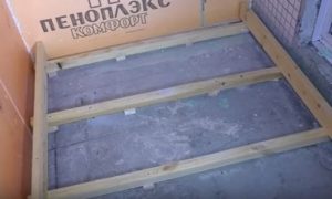 Когда пена просохнет, ее излишки срезаются. Затем перпендикулярно закрепленному брусу устанавливаются доски или брус высотой в 50 мм, на расстоянии 300÷400 мм друг от друга, в зависимости от ширины балкона. Эти деревянные перемычки должны находиться на одном уровне с поверхностью крайних досок. Затем между ними укладывается второй слой пеноплекса. |