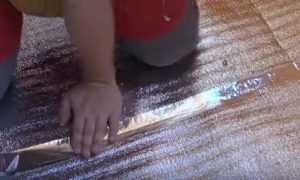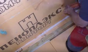 Так как в данной конструкции предусмотрена система «теплый пол», сверху плит ДСП, уложенных на обрешетку необходимо закрепить еще один слой фольгированного «Пенофола». Этот материал будет усиливать излучение от нагреваемой пленки в сторону помещения. Полотна фиксируются на поверхности также на двухсторонний скотч, а между собой отдельные листы склеиваются фольгированным скотчем. |
