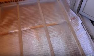 - Утепление балкона очень часто усиливается монтажом дополнительного слоя термоизоляции. Для этого применяется тонкослойный (до10 мм) рулонный материал из вспененного полиэтилена с фольгированной поверхностью. Например, «Пенофол».